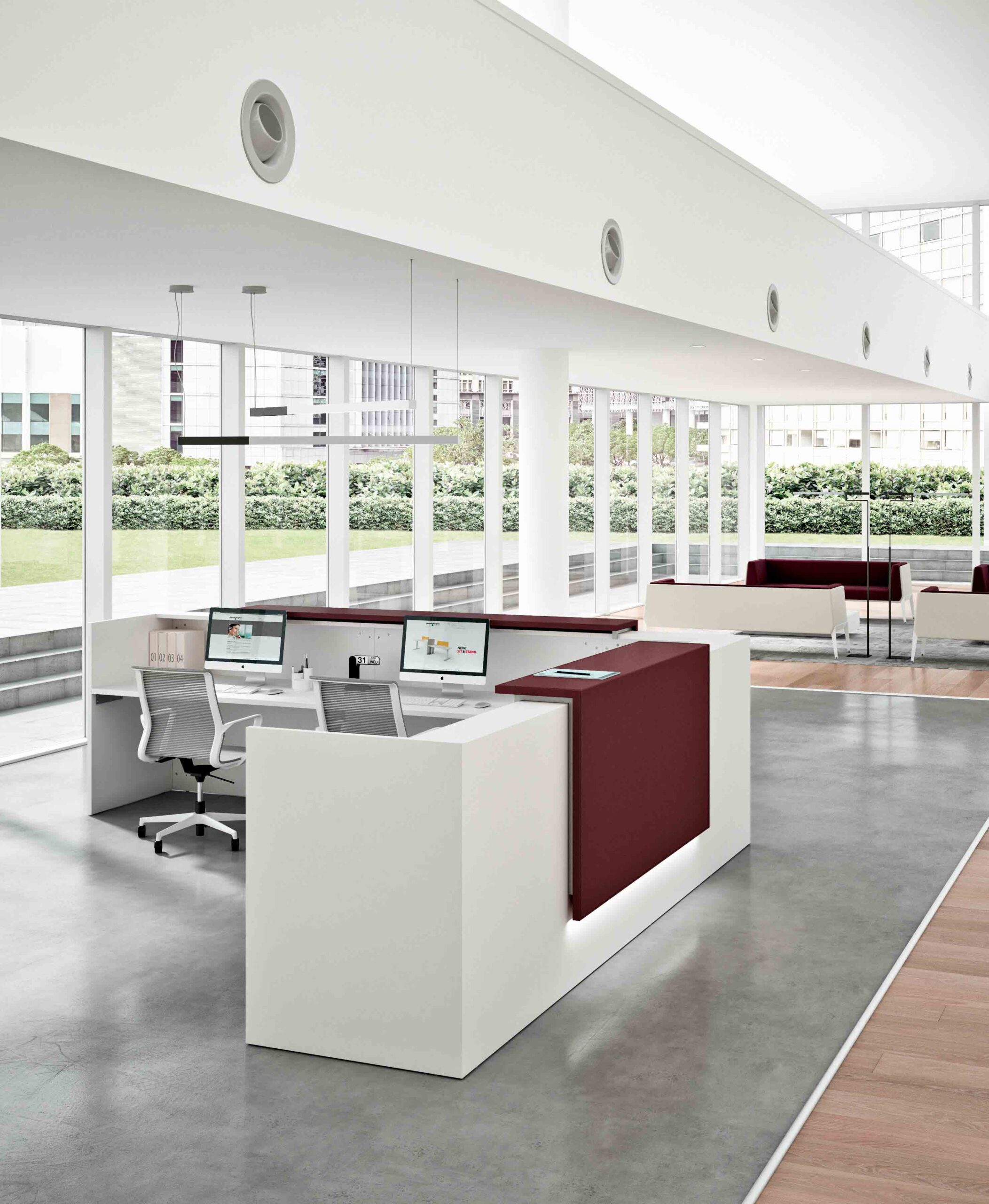 El mostrador de la recepción es el gran protagonista de este espacio y debe ser elegido cuidando el más mínimo detalle para que el resto de los elementos se adapten y giren alrededor de este. Debe transmitir al visitante la solidez y profesionalidad de la empresa. Por esto es tan importante este mueble y debe estar situado en un lugar estratégico para dar la bienvenida y que sea cómodo al paso hacia las demás oficinas.
