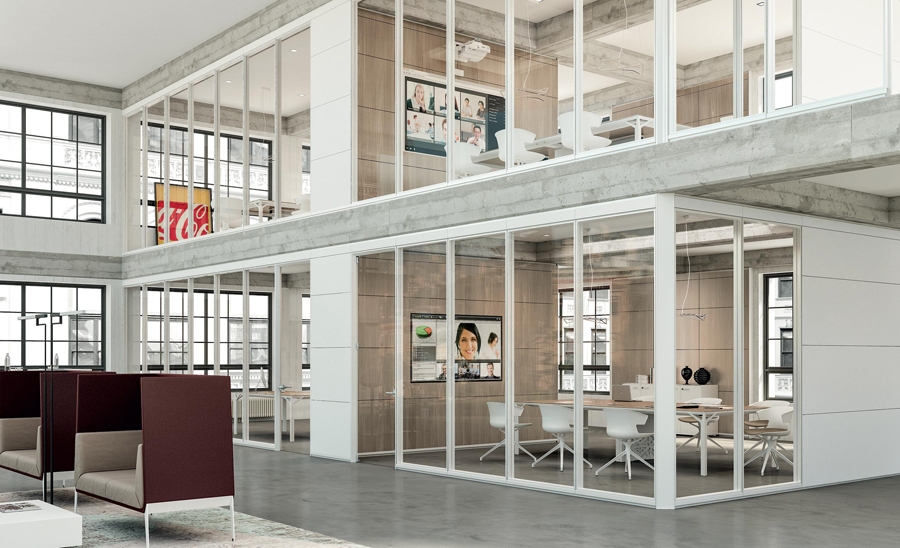 Técnica y atención a los detalles, para un trabajo eficiente y creativo. Ejemplos que destacan la modularidad y la perfecta integración entre los elementos del sistema: pared ciega, amplia pared de vidrio y por último los paneles bajos fonoabsorbentes con partes de vidrio para obtener un equilibrio acústico correcto entre espacio individual y colectivo.