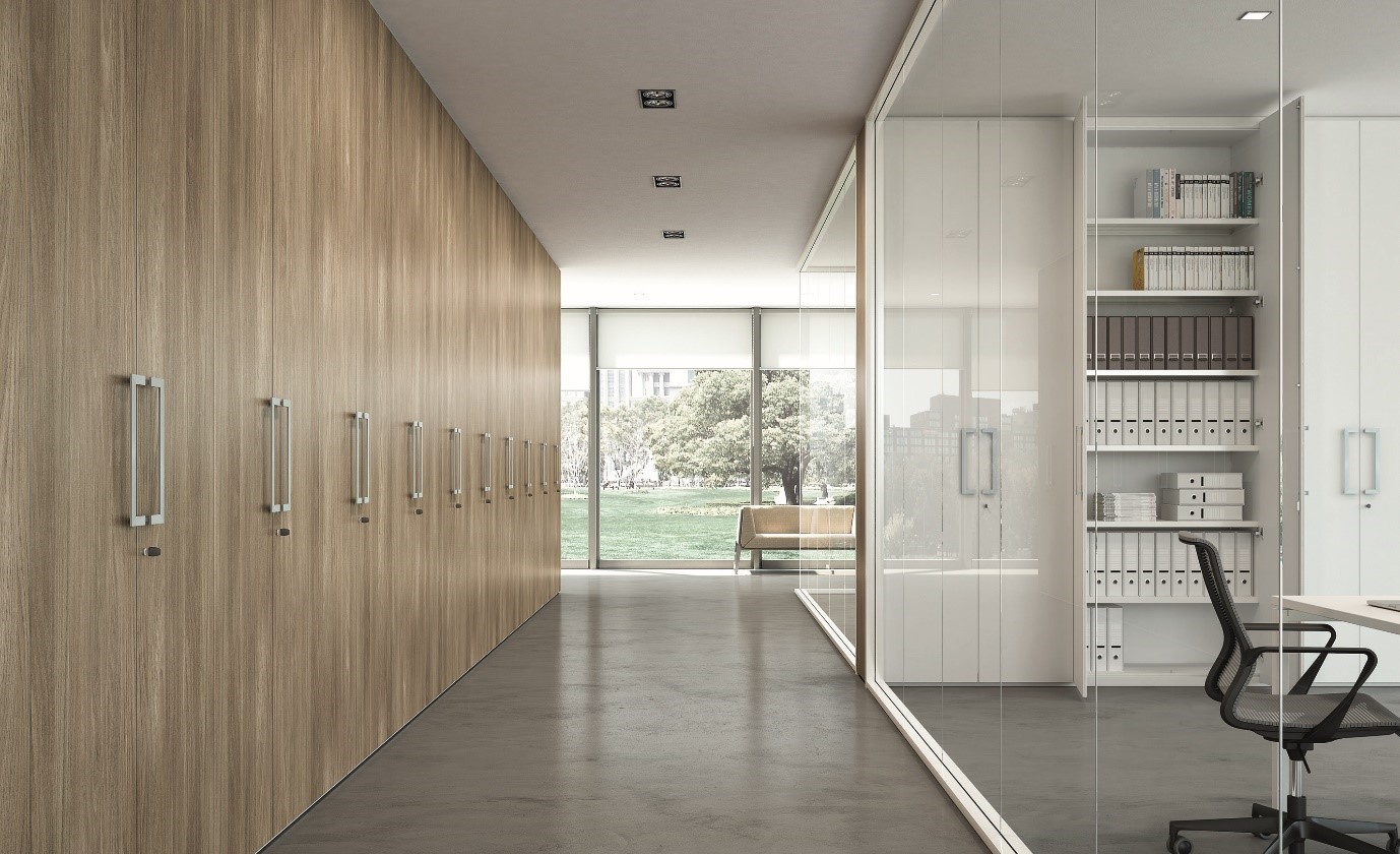 Cerraduras con varillas giratorias garantizan un cierre perfecto de las hojas. La pared S1 dispone de los siguientes accesorios: repisas en metal y madera ennoblecida, soporte para carpetas y archivadores extraíbles para organizar los materiales.
