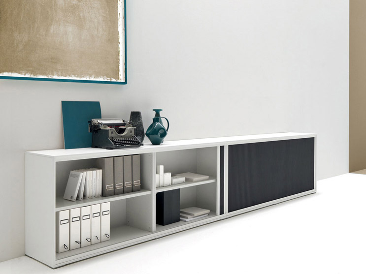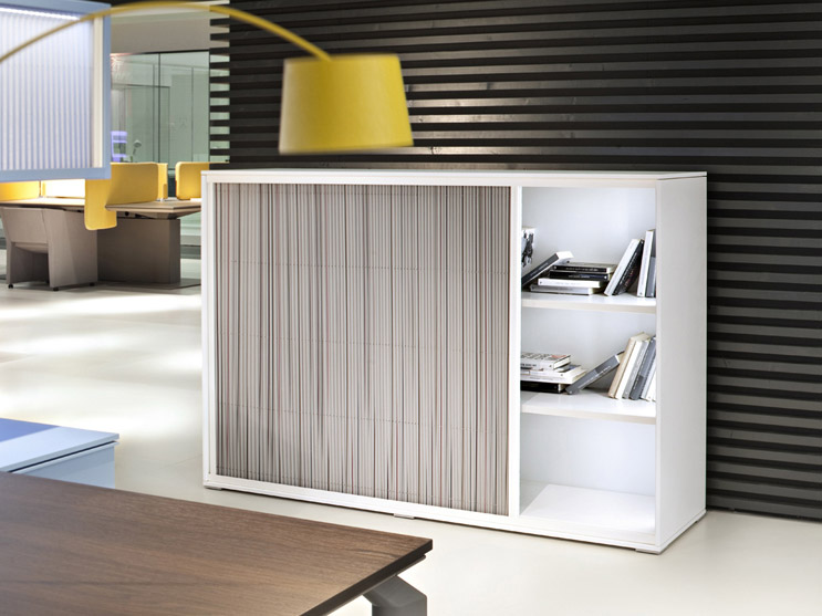 Estructuras realizadas en panel en aglomerado de Holz de grosor 18 mm. Recubierto con papel melamínico en acabado silicio. Estantes de grosor 25 mm, realizados en chapa de acero pintadas en color gris ral 9002. Solapas inferiores para el enganche de carpetas colgantes. Tapas, laterales y zócalos realizados en panel en aglomerado de Holz, recubierto con papel melamínico, chapados en madera o lacados. Traseras realizados en panel en aglomerado de Holz de grosor 14 mm, recubierto con chapa de madera, papel melamínico, lacados o en tejido. Puertas correderas realizadas en textil plisado.