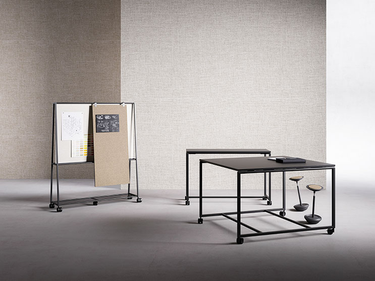 La colección Atelier se compone de 4 elementos icónicos principales: un sistema modular para librerías, escritorios sobre ruedas, mesas de colaboración y una pizarra sobre sobre ruedas.