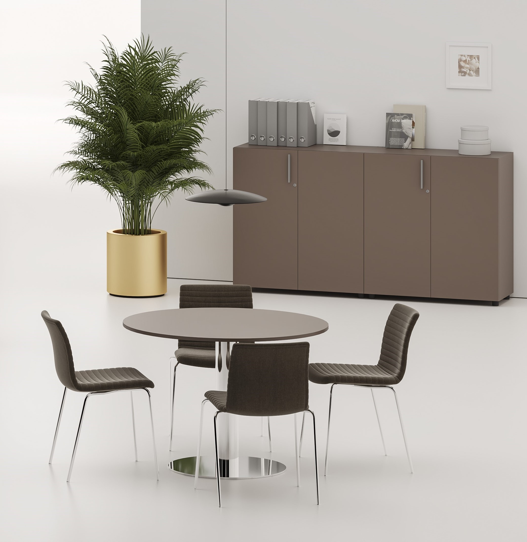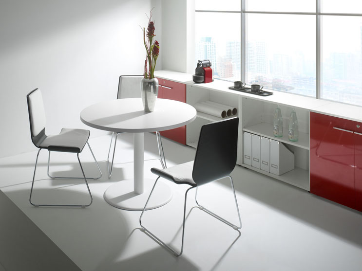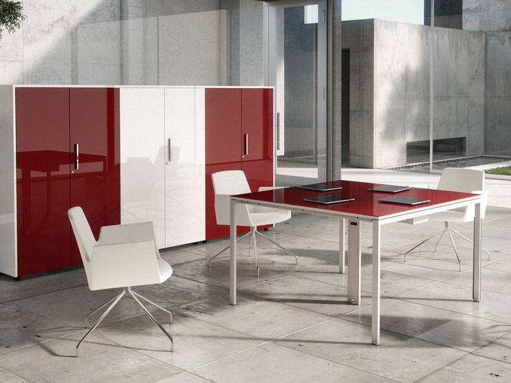 Mesa de juntas cuadrada de altura 74 cm, profundidad 120 cm y longitud 120 cm. Mesa de juntas rectangular de altura 74 cm, profundidad 110 cm y longitudes 150, 200, 300 y 400 cm. Mesa de juntas circular de altura 74 cm, y diámetro 100 y 120 cm.