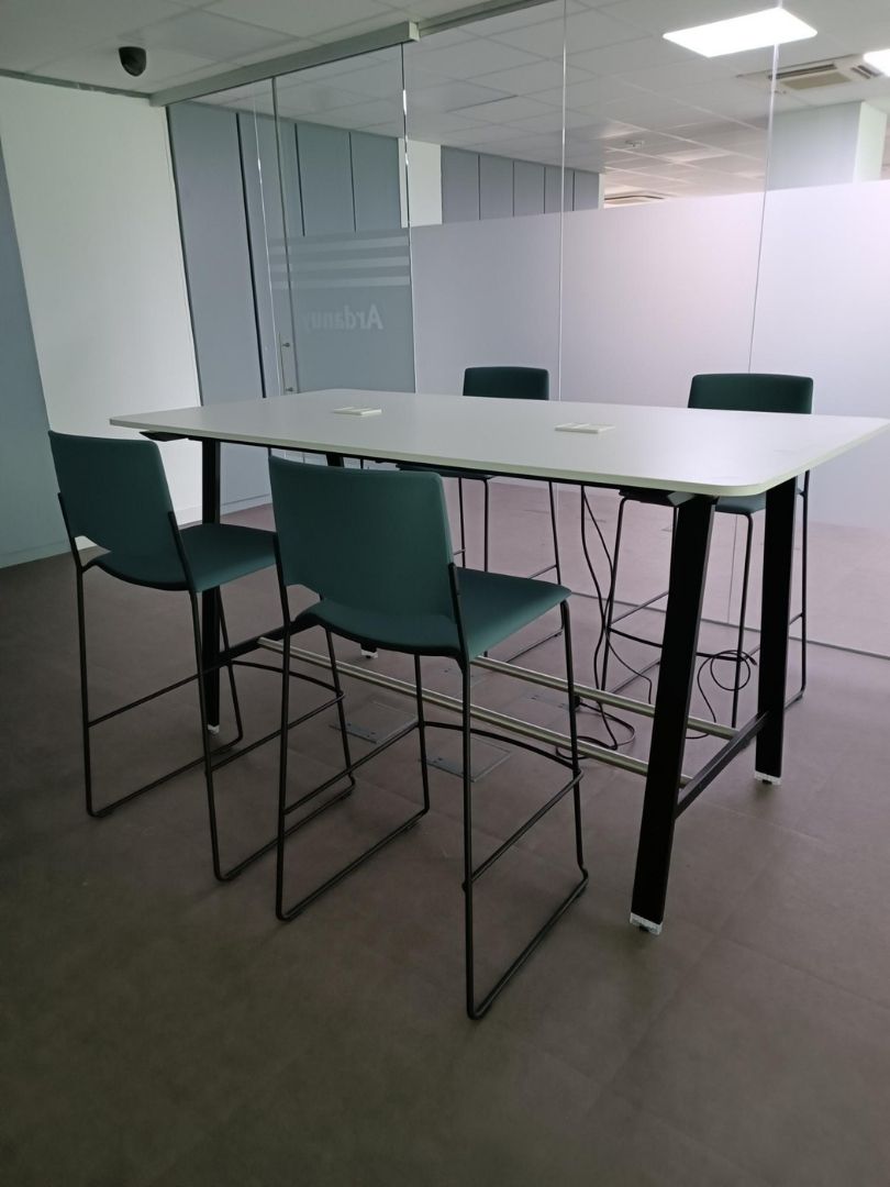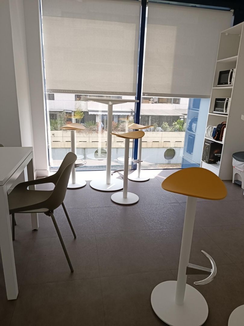 La zona de office se diseñó como un espacio versátil y acogedor. Está equipada con mesas altas acompañadas de taburetes, así como con mesas de 74 cm de altura con sillas de cuatro patas, ofreciendo distintas opciones según el uso previsto. Tanto las sillas como los taburetes cuentan con acabados en polipropileno en diversos colores. Este material es cómodo y funcional.