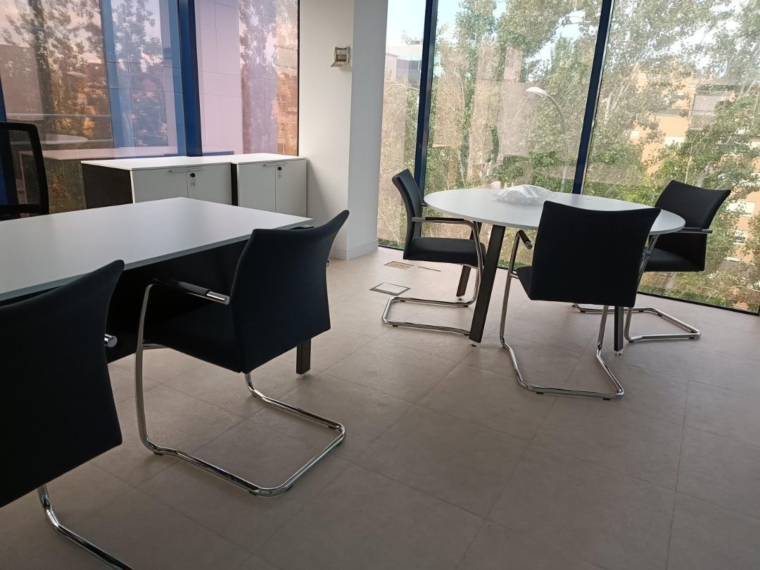 En los laterales de la oficina se ubicaron los despachos y las salas de reuniones, espacios que quedaron separados del área principal mediante mamparas de vidrio. Esta solución permite mantener la sensación de amplitud y luminosidad, al tiempo que garantiza la privacidad necesaria para reuniones y tareas que requieren mayor concentración.